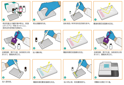 本产品基于双抗夹心法酶联免疫吸附原理,样品中荞麦蛋白先与预包被抗体结合,再与酶标抗体反应形成“抗体-抗原-抗体”夹心复合物。加入显色液后,复合物上标记的酶催化底物生成蓝色产物,终止反应后变为黄色,在450 nm处吸光度值与荞麦蛋白浓度成正比。